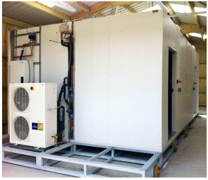 The LEC comprises two rooms with a combined volume of over 80 m3. One room mimics the internal environment, e.g. a living room or cellular office space, and the other mimics the outdoor environment. Relative humidity and temperature can be maintained at fixed levels or programmed to vary with time. Temperature can be varied from -20°C to + 40°C and humidity between 10% and 95% RH. Prototype test walls are constructed (either built in-situ or delivered prefabricated) between the two rooms and environmental conditions are programmed to reflect conditions in the real environment.